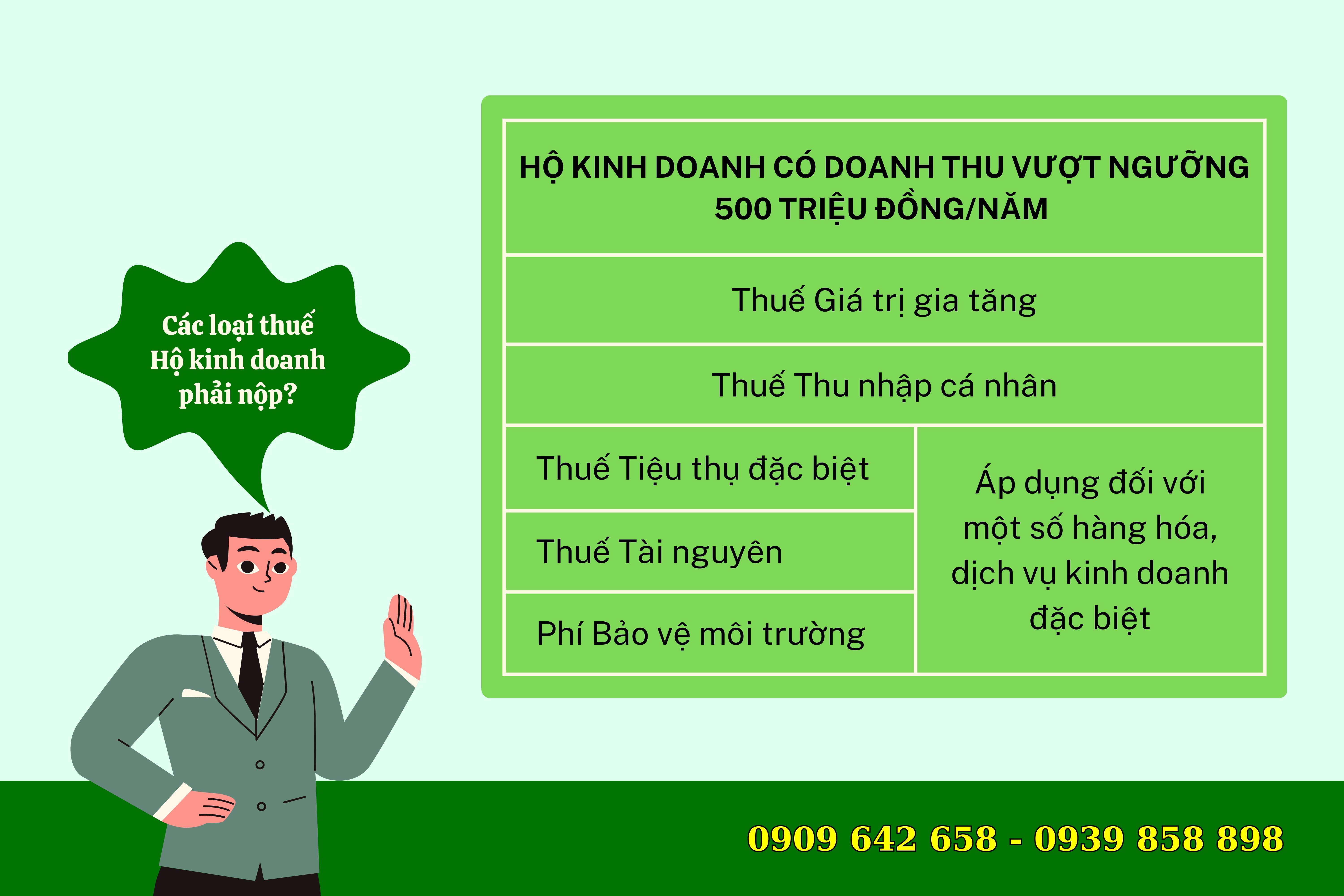 Ngoài ra, còn có thuế tiêu thụ đặc biệt đối với hộ kinh doanh sản xuất, rượu bia, thuốc lá, xăng, cung cấp dịch vụ vũ trường, karaoke,…. ; thuế tài nguyên đối với hộ kinh doanh có hoạt động khai thác tài nguyên như khoáng sản, dầu thô, khí thiên nhiên, sản phẩm của rừng, hải sản tự nhiên, nước thiên nhiên,…; Phí bảo vệ môi trường đối với khai thác khoáng sản.