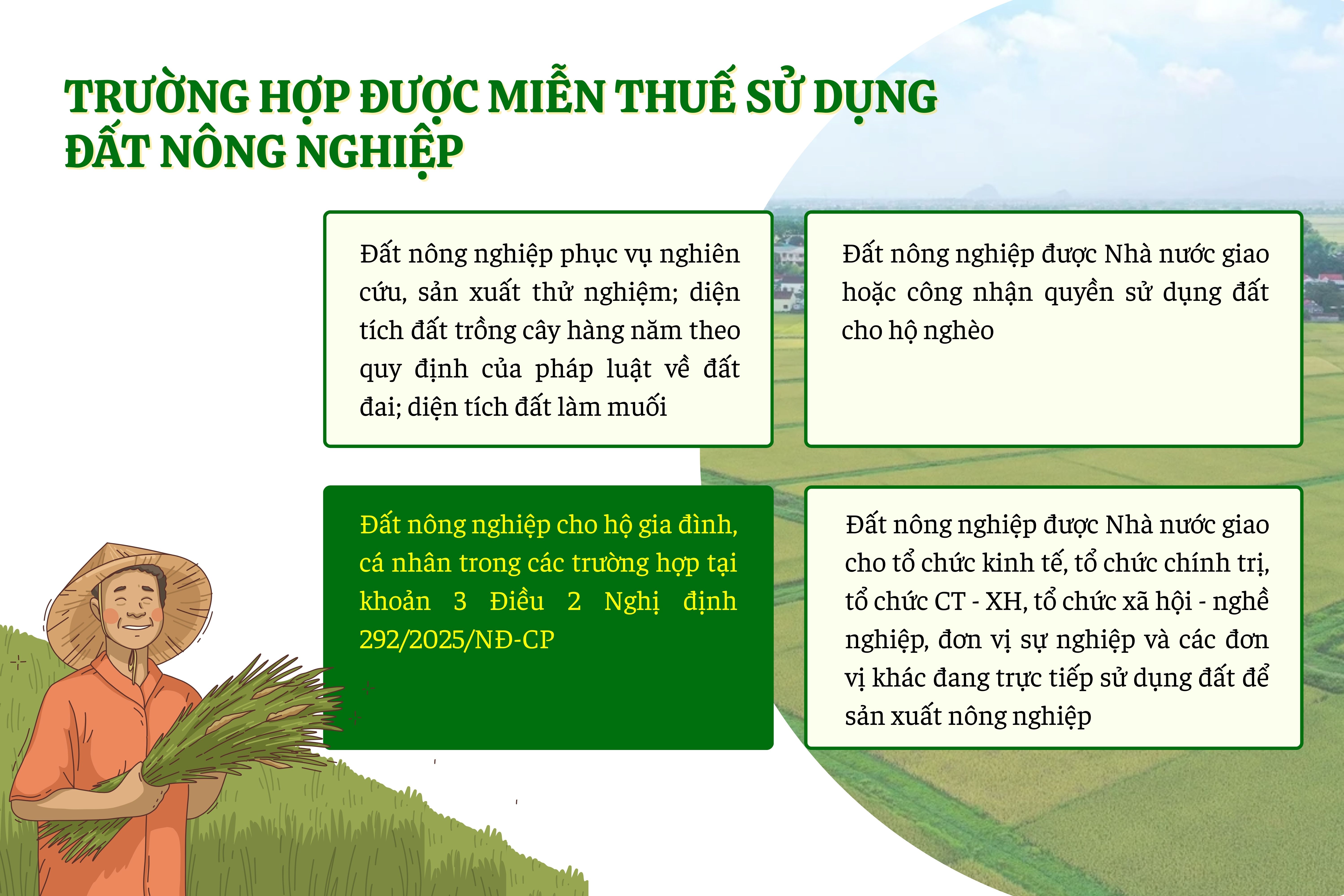 Tại Điều 2 Nghị định 292/2025/NĐ-CP quy định về Đối tượng được miễn thuế sử dụng đất nông nghiệp, theo quy định tại điều khoản này thì các đối tượng được miễn thuế sử dụng đất nông nghiệp thực hiện theo quy định tại Điều 1 Nghị quyết số 55/2010/QH12 ngày 24/11/2010 của Quốc hội về miễn, giảm thuế sử dụng đất nông nghiệp (đã được sửa đổi, bổ sung một số điều theo Nghị quyết số 28/2016/QH14 ngày 11/11/2016 của Quốc hội), cụ thể như sau: